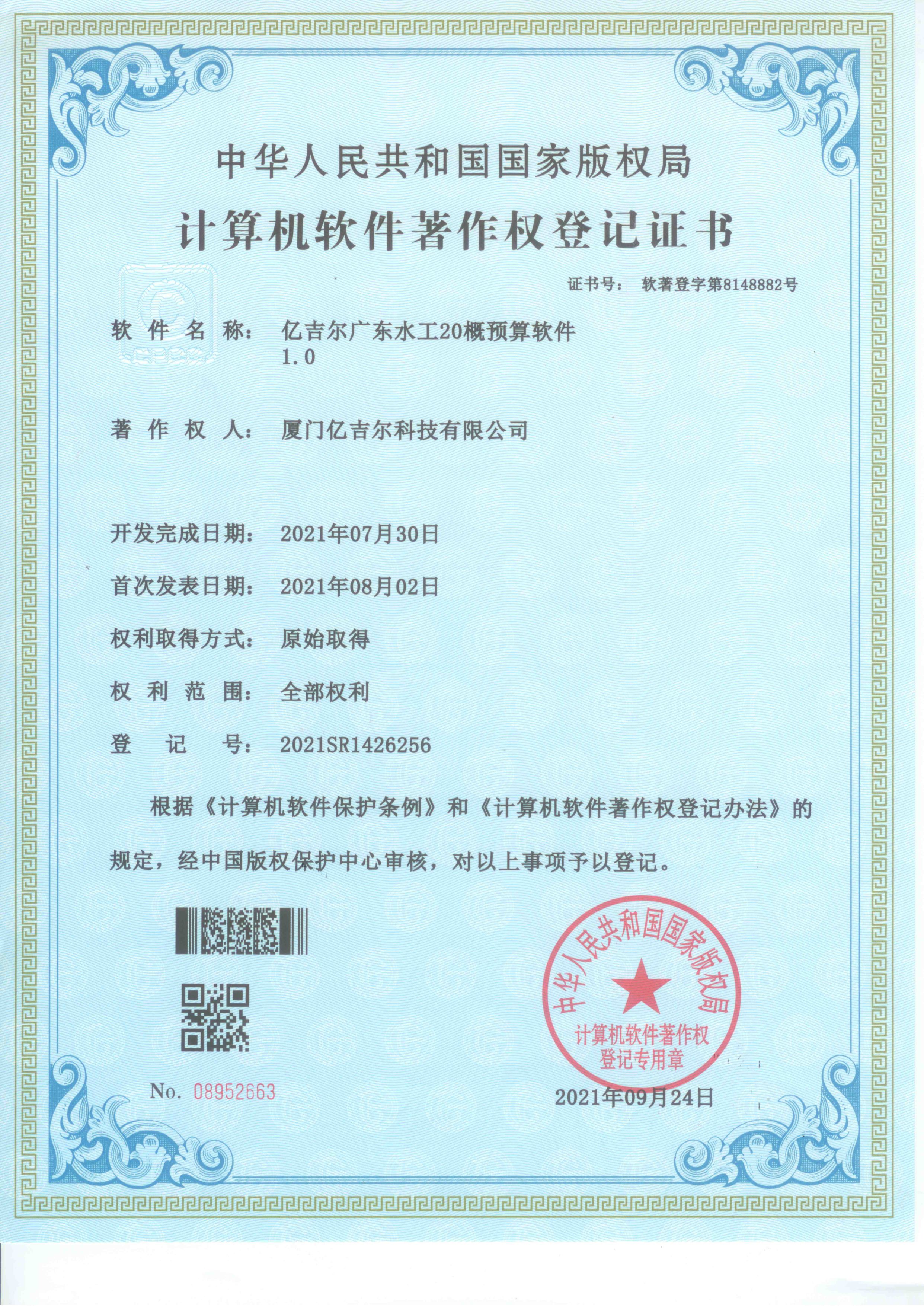 億吉爾廣東水工20概預(yù)算軟件著作權(quán)登記證書 發(fā)布日期:2023年11月22日 瀏覽次數(shù):1842 關(guān)鍵字: 公司 1/1億吉爾廣東水工20概預(yù)算軟件著作權(quán)登記證書_1